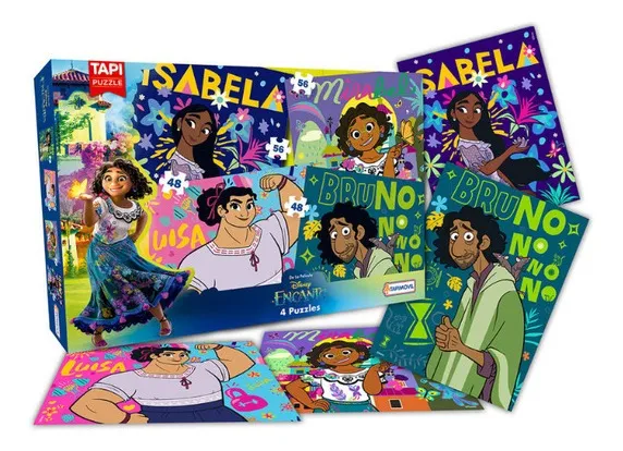 4 Rompecabezas: 2 de 48 piezas y 2 de 56 piezas Modelo: Encanto Licencia Oficial Medidas: 32×22 cm CAJA