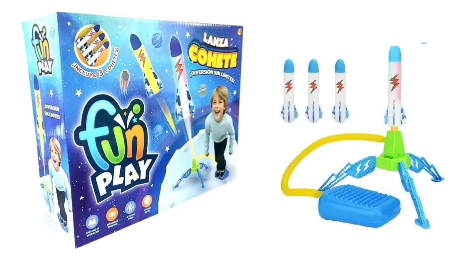 escripción:IMPORTANTE!!! LAS IMAGENES SON ESTRICTAMENTE DE CARACTER ILUSTRATIVO PRODUCTO SUJETO A CAMBIOS EL COLOR PUEDE VARIAR O EL DISEÑO . ESTE SET INCLUYE : 3 COHETES DE GOMA ESPUMA (INOFENSIVOS) , EL PEDAL DE LANZAMIENTO Y OTROS ACCESORIOS PARA ARMAR EL LANZA COHETE. PARA JUGAR AL AIRE LIBRE MARCA:FUN PLAY EDAD RECOMENDADA + 3 AÑOS.